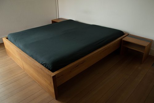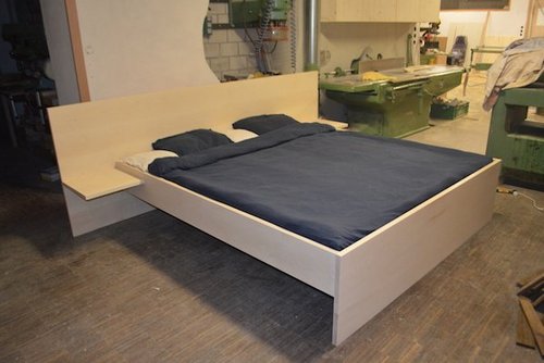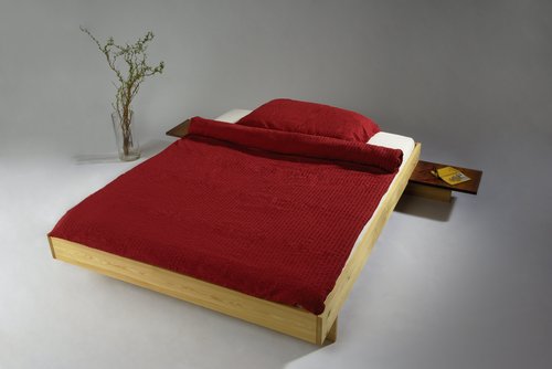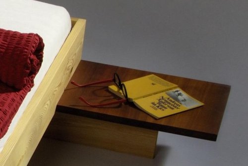 einfache Bettform; durch die zurückhaltend gestaltenden Füsse wirkt das Bett leicht schwebend